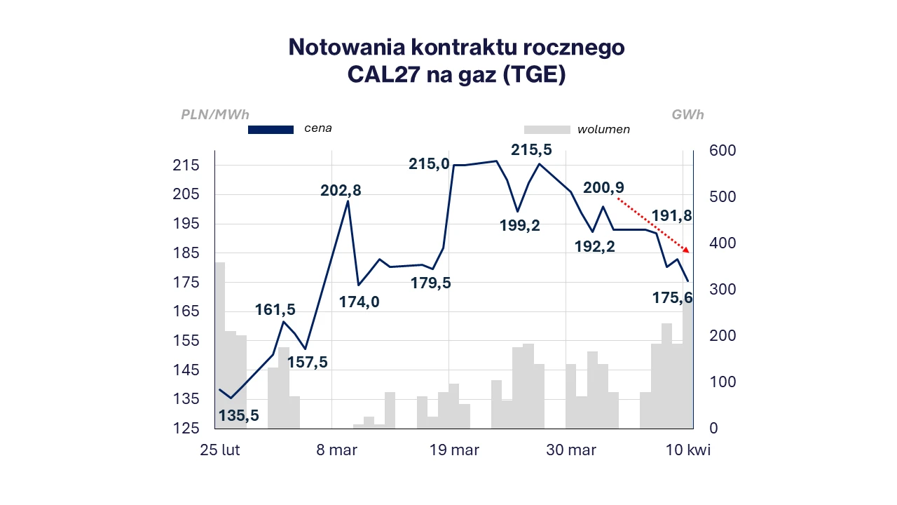 Notowania kontraktu rocznego CAL27 od piątku ulegały sukcesywnej korekcie z poziomu 193,00 PLN/MWh pod koniec tygodnia, do 183 PLN/MWh na wczorajszym zamknięciu sesji. Ceny gazu w Polsce podążały za impulsami z europejskiego rynku, liczącego na oznaki zakończenia wojny na Bliskim Wschodzie. Od poniedziałku udział gazu w polskim miksie wynosił średnio ok. 12%, tylko we wtorek spadł do 8%. Produkcja energii z węgla zmniejszyła się na początku tygodnia i stanowiła ok. 40% struktury wytworzenia, a potem powróciła do poziomu ok. 52% polskiego miksu. Udział energii z farm wiatrowych w produkcji energii wzrósł z 15% do 26% w poniedziałek i wtorek.