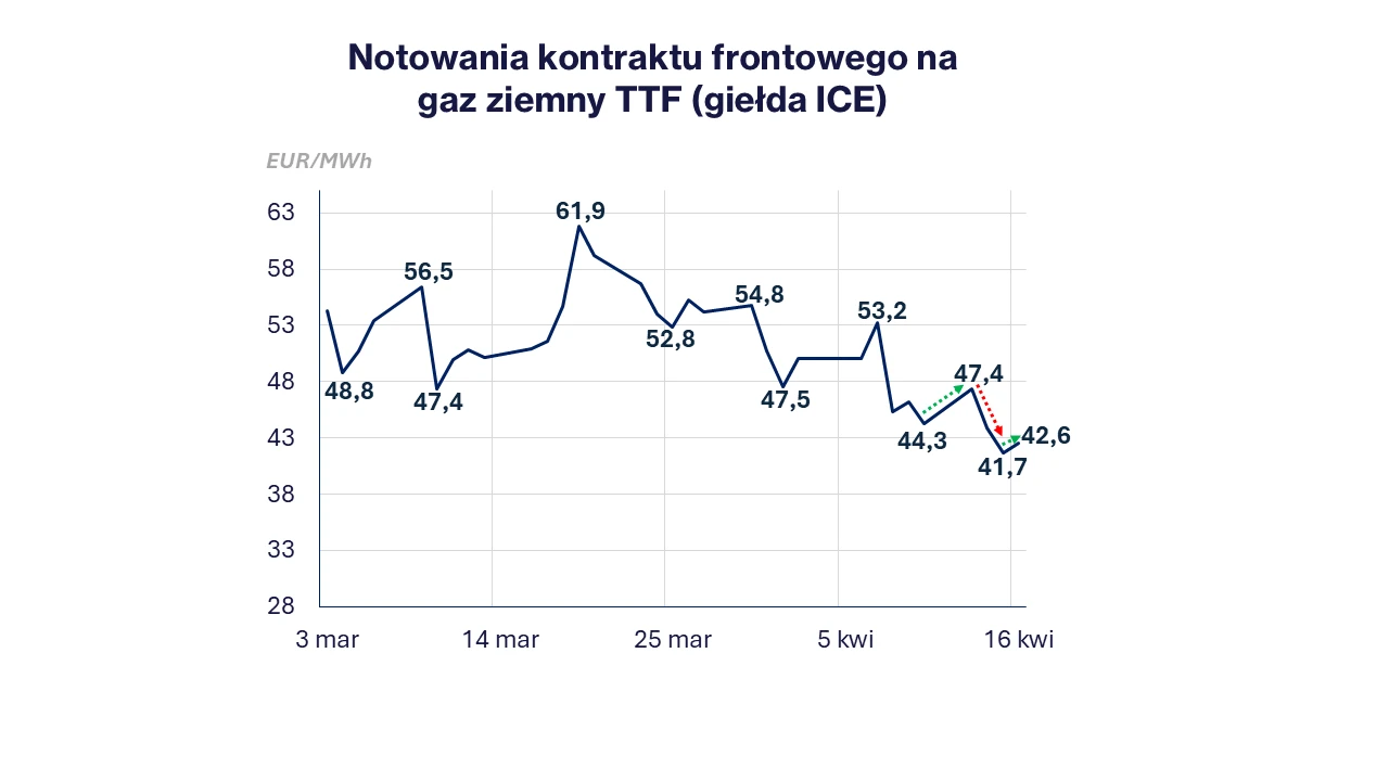 W całym minionym tygodniu ruchy cen gazu pozostawały silnie skorelowane z notowaniami ropy, co jest typowe w okresach nasilonych napięć geopolitycznych, gdy rynki surowcowe reagują na te same czynniki ryzyka. Piątkową sesję (10.04) zakończyliśmy 5% spadkiem notowań gazu (TTF MAY26) do poziomu 43,64 EUR/MWh. Inwestorzy liczyli, że zawieszenie broni na Bliskim Wschodzie utrzyma się. Ceny gazu wzrosły na początku tygodnia do poziomu 50 EUR/MWh po tym, jak rozmowy USA–Iran zakończyły się niepowodzeniem oraz po zapowiedzi możliwej blokady morskiej w Cieśninie Ormuz, co wzmocniło obawy o długotrwałe zakłócenia podaży. W kolejnych dniach notowaniom towarzyszył trend spadkowy, gdy rosły nadzieje na drugą rundę rozmów pokojowych. Ceny sięgnęły najniższego poziomu – ok. 41,6 EUR/MWh w środę po południu (15.04). Pakistan mierzy się z największym kryzysem energetycznym od lat, ponieważ wcześniej pozyskiwał niemal całe LNG, wykorzystywane do produkcji energii elektrycznej, z Kataru, który został zmuszony do wstrzymania eksportu po atakach na początku marca. Według ministerstwa energii deficyt mocy osiągnął 4 500 MW w środę wieczorem, czyli w czasie, gdy zapotrzebowanie zazwyczaj jest najwyższe. Według ministerstwa rotacyjne wyłączenia prądu, w niektórych regionach wydłużyły się do ponad dwóch godzin w godzinach wieczornych. Według lokalnych źródeł czasem trwają o wiele dłużej – nawet 14 godzin. W danych widoczny jest spadek importu LNG do Europy, przypadający na intensywny okres napraw na w norweskich zakładach. W efekcie rozpoczynamy okres mniejszej podaży z dwóch głównych źródeł podaży.