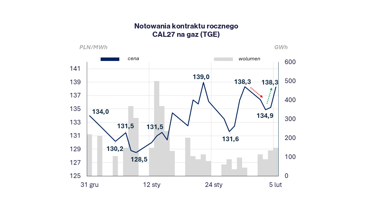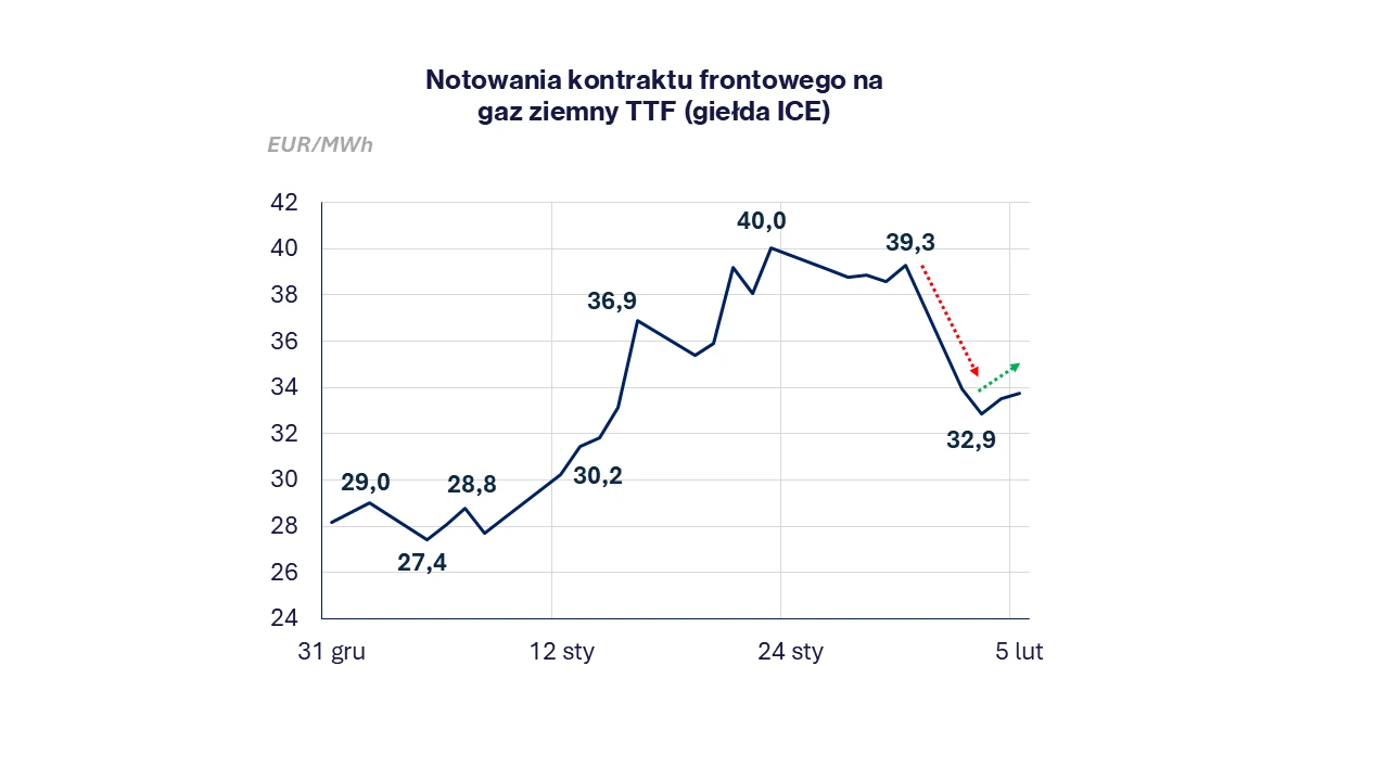 Od ubiegłego czwartku (29.01) notowania gazu w punkcie TTF (MAR26) najpierw wzrosły w piątek do 39,3 EUR/MWh, a następnie spadły o 14% podczas poniedziałkowej sesji do poziomu 33,9 EUR/MWh. We wtorek nastąpiło pogłębienie korekty do 32,9 EUR/MWh. Zakończenie poprzedniego tygodnia na wysokim poziomie, zapewniły obawy o rozwój sytuacji w Iranie oraz ponowny wzrost cen gazu w USA. Dodatkowo kompleks Golden Pass LNG, który miał rozpocząć eksport skroplonego gazu w styczniu, najprawdopodobniej pierwszą jednostkę wyśle nie szybciej niż w marcu. Warto zauważyć, że głównym nabywcą amerykańskiego LNG jest Europa, której magazyny zapełnione są w 39% wobec średniej 5-letniej dla tego okresu, oscylującej wokół 56%. Poniedziałkowa korekta do wynikała z kolei z: redukcji premii za ryzyko eskalacji Iran-USA, powrotu poboru gazu z sieci przez amerykańskie kompleksy LNG do poziomu sprzed fali mrozu (tj. +60% od początku ubiegłego tygodnia), a także decyzji inwestorów spekulacyjnych o realizacji zysków z 40% styczniowego rajdu cenowego w kontraktach na TTF. Dodatkowo we Francji przywrócono większą generację z elektrowni jądrowych, a na początku tygodnia odnotowano rekordową produkcję energii z farm wiatrowych – co łącznie z oczekiwanych ociepleniem w dalszej części tygodnia- doprowadziło do obserwowanej korekty na rynku. Późniejsze odbicie cen do 34 EUR/MWh podczas dzisiejszej sesji wynika z obaw o ochłodzenie po 13 lutego w Europie oraz niskie stany magazynowe w Niemczech przy oczekiwanym w przyszłym tygodniu spadku wytworzenia z tamtejszych farm wiatrowych.