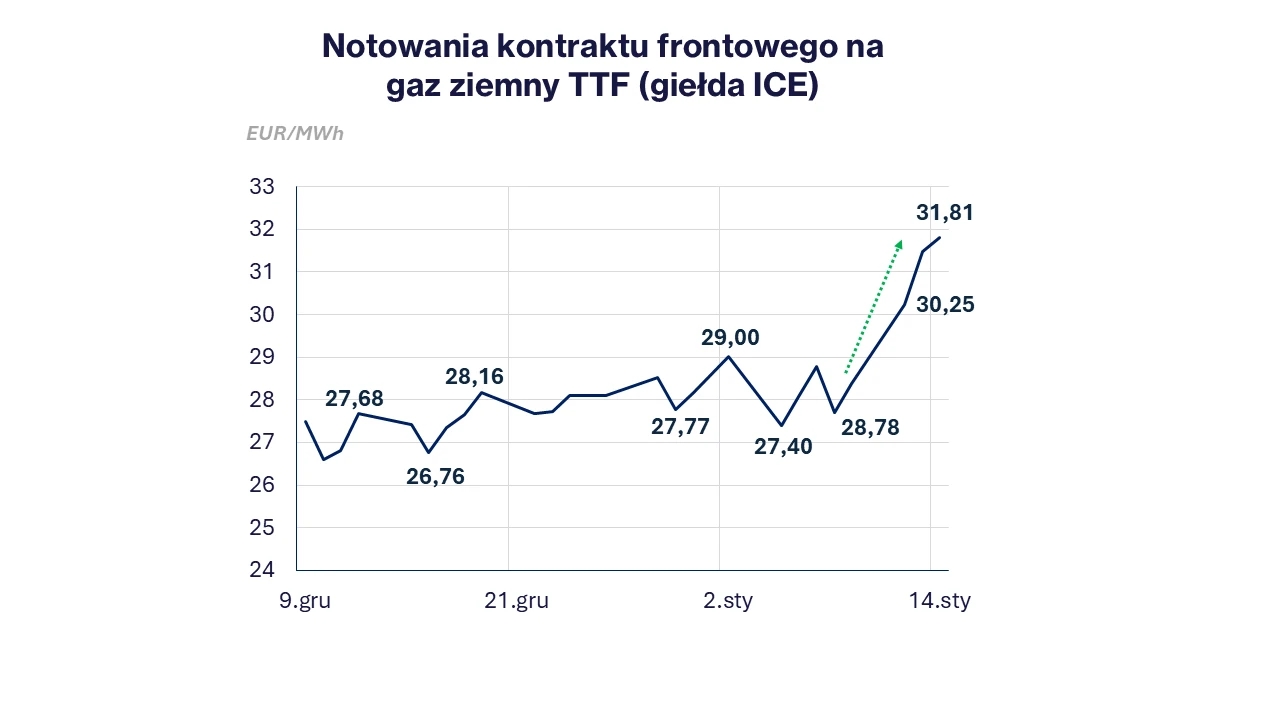Od końca ubiegłego tygodnia notowania gazu w punkcie TTF (FEB26) wzrosły z poziomu 28,4 EUR/MWh powyżej 31,8 EUR/MWh na zamknięciu wczorajszej (14.01) sesji giełdowej. Można wskazać cztery główne powody obserwowanego wzrostu cen gazu w Europie. Przed wszystkim zeszłotygodniowe mrozy, doprowadziły do rekordowego poboru gazu w Europie zarówno do celów grzewczych, jak i w energetyce wraz z niższą generacją farm wiatrowych. Z kolei najnowsze prognozy wskazują na istotne ochłodzenie pod koniec miesiąca, co budzi obawy rynku o przedwczesne wyczerpanie unijnych magazynów (zapełnienie ok. 53% wobec średniej 5-letniej dla tego okresu w okolicy 68%). Mając na uwadze nadchodzące ochłodzenie również w Azji, niektórzy uczestnicy rynku obawiają się większej konkurencji o dostawy LNG. Finalnie napięcie na linii USA- Iran, zwiększyło premię za ryzyko na giełdach, uwzględniając możliwość blokady Cieśniny Ormuz przez władze. W reakcji na wysoki popyt na gaz w Europie oraz niepewną sytuację na Bliskim Wschodzie, fundusze inwestycyjne zredukowały skalę „gry na spadek cen gazu” na giełdzie ICE (prowadzoną w oczekiwaniu na ekspansję dostaw LNG na świecie i ciepły początek zimy).