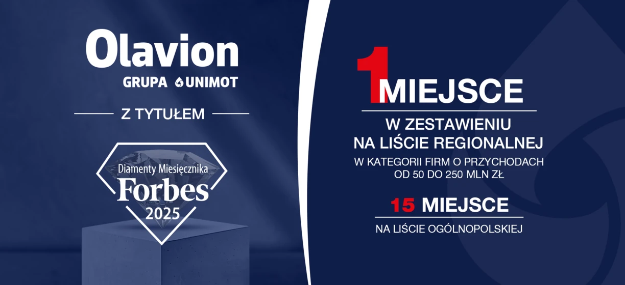 Olavion, spółka z Grupy UNIMOT specjalizująca się w logistyce kolejowej, została wyróżniona tytułem Diamentu Forbesa 2025. Firma zajęła 1. miejsce w zestawieniu regionalnym (woj. pomorskie) oraz 15. miejsce na liście ogólnopolskiej w kategorii przedsiębiorstw o przychodach od 50 do 250 mln zł.