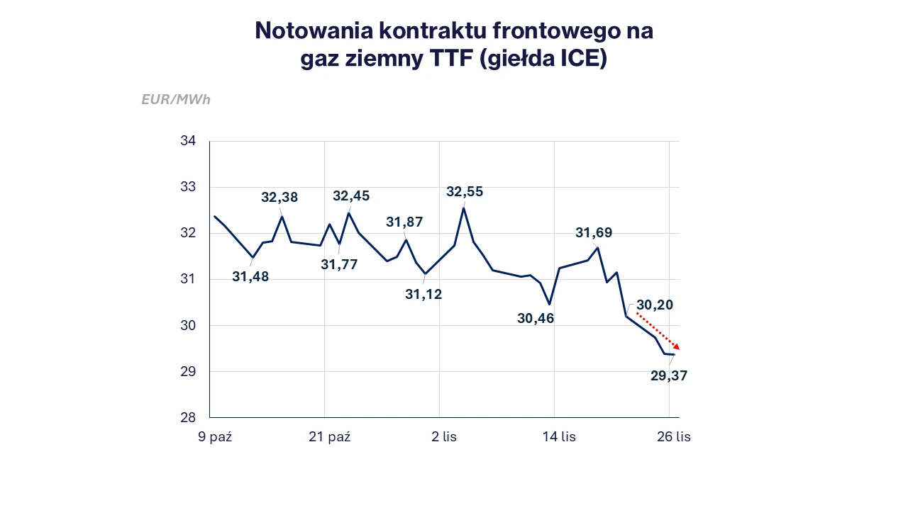 W minionym tygodniu ceny gazu (DEC25) kierowały się tendencją spadkową z poziomu 30,20 EUR/MWh w zeszły piątek (21.11) do 29,37 EUR/MWh wczoraj (26.11). Na ceny gazu wpływały przede wszystkim rozwój sytuacji geopolitycznej wokół planu pokojowego dla Ukrainy, zmieniające się prognozy pogody w Europie, stabilna i wysoka podaż LNG oraz zmienna produkcja energii z wiatru.