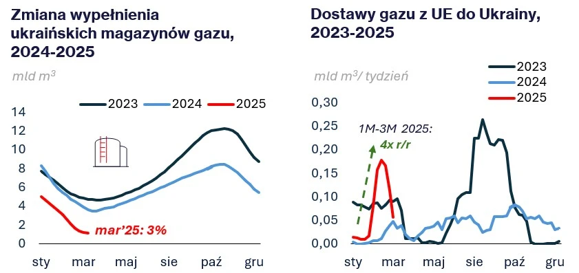Drugi ważny aspekt to niski poziom zapełnienia unijnych magazynów gazu (34,3% tj. o 46% niższy poziom od 5-letniej średniej) i krytycznie niski poziom zapełnienia magazynów ukraińskich (3,56%). W związku z tym, trwają negocjacje państw UE o zmianie celu wypełnienia magazynów gazu. Komisja Europejska ogłosiła utrzymanie obecnych celów do 2027 roku, ale musi to zostać zatwierdzone przez państwa UE oraz Parlament Europejski. Niemcy, Francja i Holandia wskazują, że obowiązujące terminy zapełnienia magazynów nie tylko powodują wzrost cen, ale tworzą okazję do manipulacji cenowej (inni uczestnicy rynku wiedzą, że kraje wspólnoty będą zmuszone kupić gaz przed konkretną datą). Dlatego według nieoficjalnej propozycji negocjowany jest wariant: 90% zapełnienia magazynów w okresie od 1 października do 1 grudnia.
