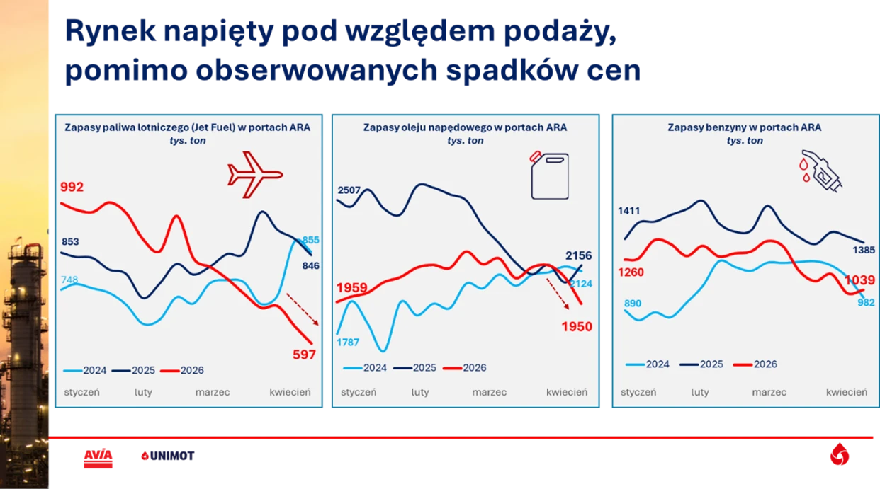 Szczególnie wrażliwym segmentem rynku pozostaje paliwo lotnicze, którego zapasy w Europie utrzymują się na krytycznie niskim poziomie. Wysoka zależność od importu oraz brak stabilnych dostaw zwiększają podatność tego segmentu na zakłócenia logistyczne – zaznacza Sikorski.