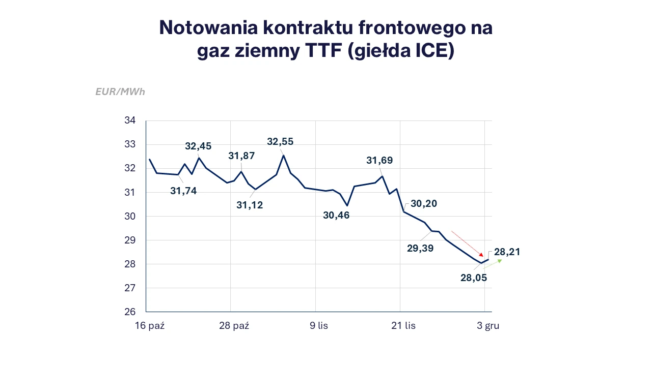 Na przestrzeni ostatniego tygodnia notowania gazu (JAN26) charakteryzowały się przeważającą tendencją spadkową. Od zeszłego piątku (28.11) do obecnego wtorku (02.12) ceny spadły z poziomu 28,82 EUR/MWh do 28,05 EUR/MWh. Powodem było utrzymanie zadowalającego poziomu importu LNG do Europy oraz prognozy cieplejszej od oczekiwań, drugiej połowy grudnia w Europie.