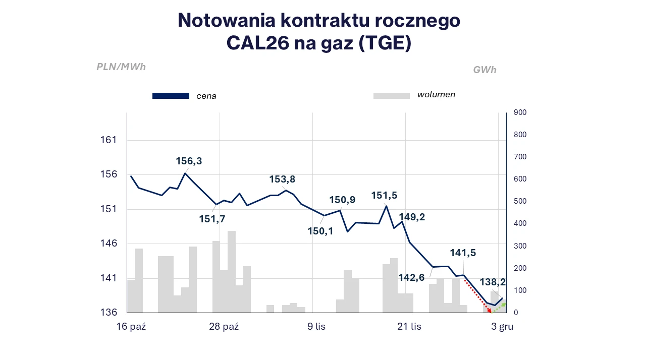 Pod koniec zeszłego tygodnia notowania kontraktu CAL26 na polskiej TGE kierowały się tendencją spadkową, dochodząc do najniższego poziomu we wtorek (02.12) wynoszącego 137,13 PLN/MWh. Następnie ceny wzrosły do 138,15 PLN/MWh wczoraj (03.12).