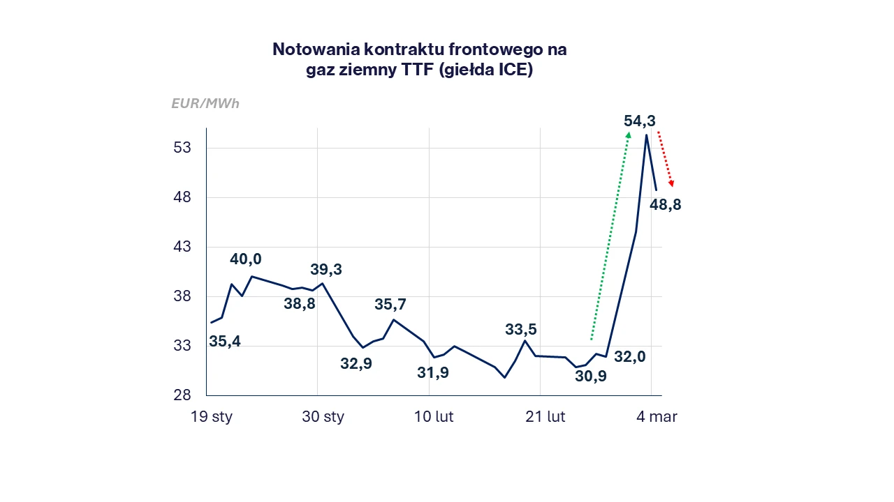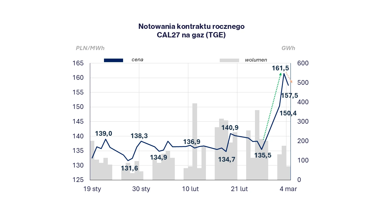 Jeśli chodzi o sytuację związaną z wojną na Bliskim Wschodzie, notowania w Polsce podążają za paniką na rynkach Europy Północno-Zachodniej. Jednocześnie Gaz-System uspokaja w komunikatach, że bezpieczeństwo dostaw zapewniają możliwość importu z Norwegii przez Baltic Pipe, fizyczny rewers z Niemiec oraz rosnąca podaż LNG z USA.