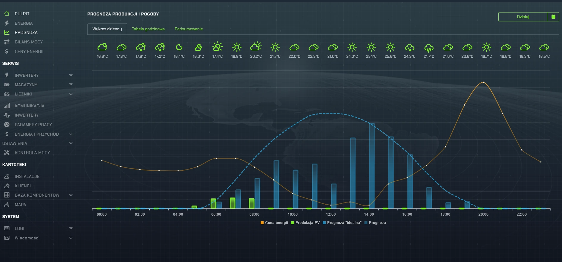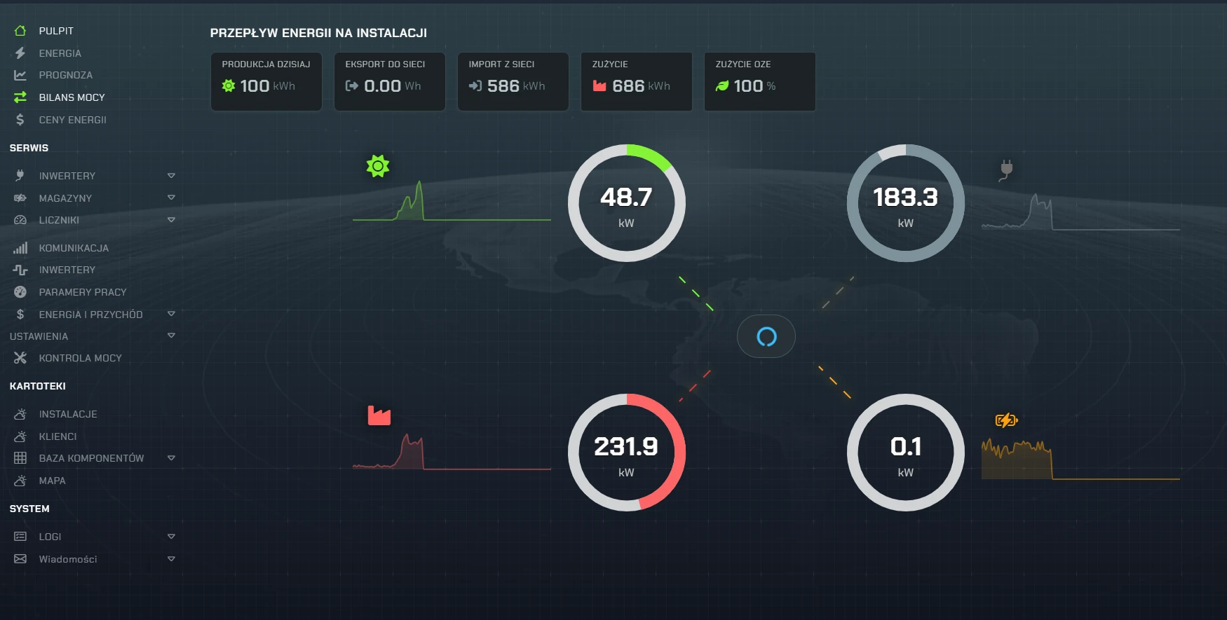 Nadzór kluczowych parametrów instalacji w jednym, centralnym miejscu w formie czytelnych raportów i wykresów, pozwala na łatwą i szybką kontrolę wydajności pracy całej instalacji