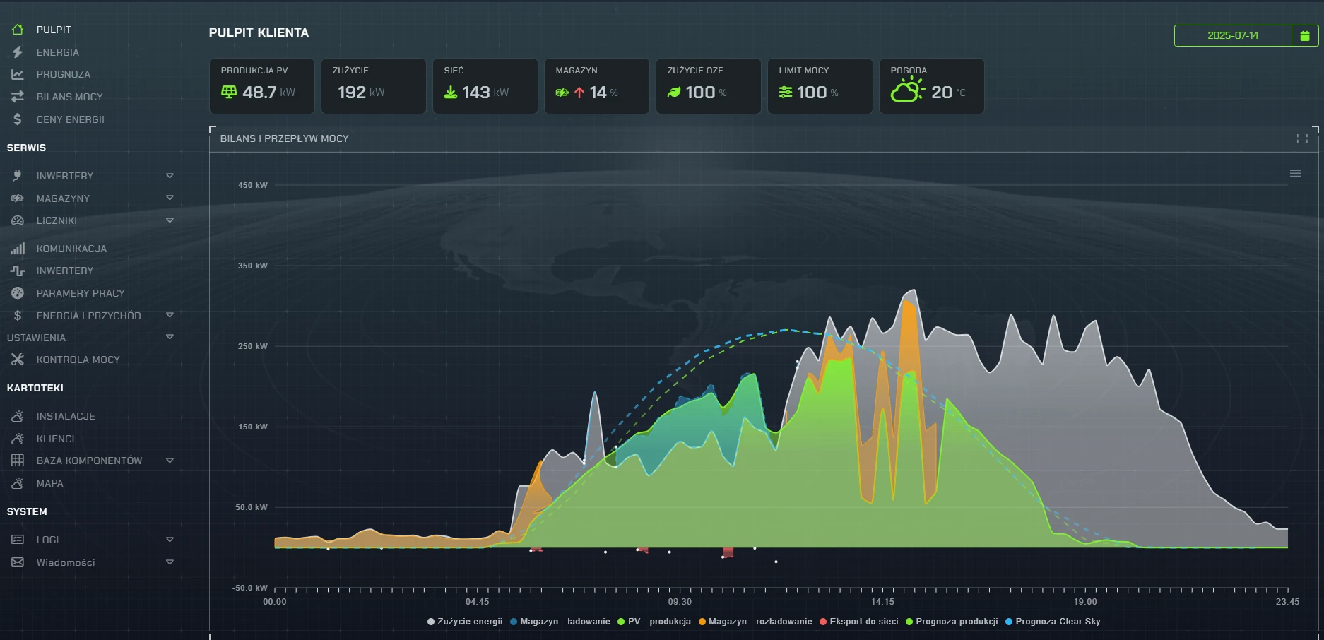 Zarządzanie przepływem energii na instalacji - sterowanie mocą produkcji, kontrola magazynów energii, sterowanie odbiorami na instalacji w korelacji z aktualną cenę energii na giełdzie - osiąganie maksymalnej korzyści finansowej.